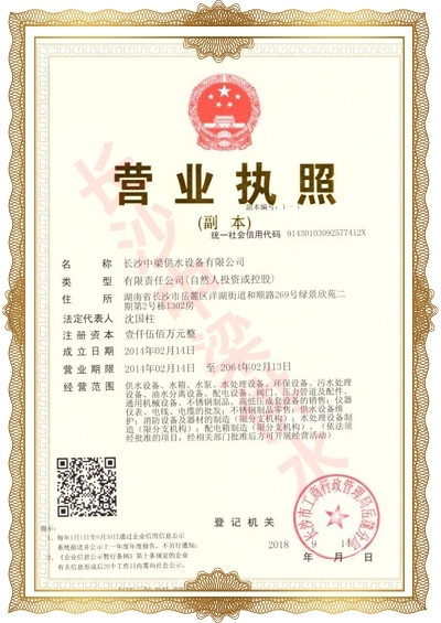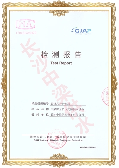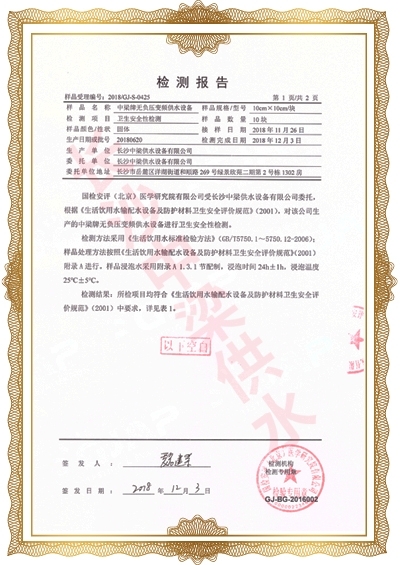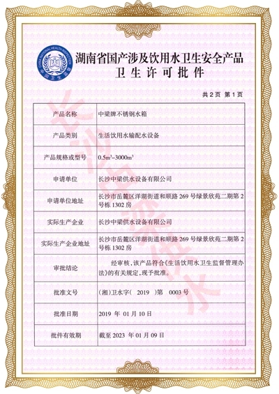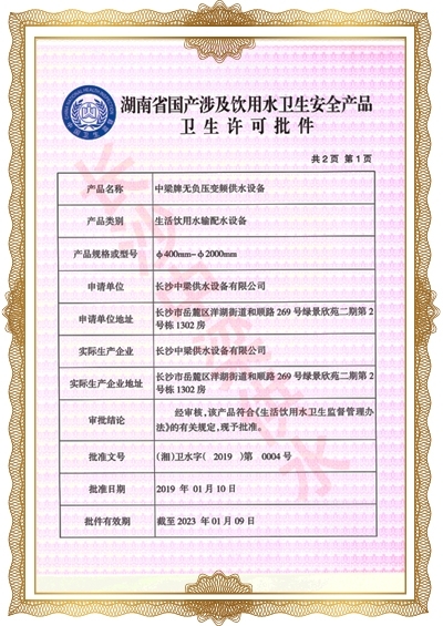長沙中梁供水設(shè)備有限公司已先后通過湖南省衛(wèi)生廳國產(chǎn)涉及飲用水衛(wèi)生產(chǎn)品衛(wèi)生許可批準(zhǔn);